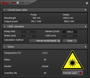 Easy experiment setup with a fully integrated systemThe compact CARS laser is fully controlled through the system software LAS AF. The tight integration of the laser control into the software makes the sophisticated process of adjusting multiple parameters of the system completely transparent. This solution offers the most convenient way to perform CARS experiments – for experts and novices alike.