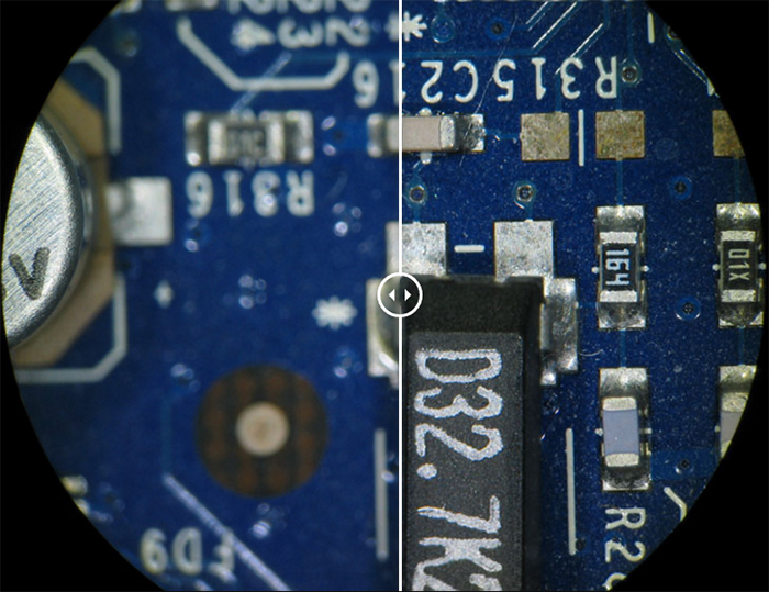 (Lưu ý: Mô phỏng hình ảnh, hiển thị mẫu bảng mạch in khi không và có sử dụng hiệu ứng FusionOptics, khi quan sát qua thị kính. |