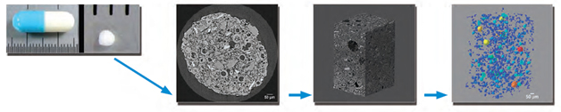 Hình ảnh dưới đây thể hiện các phân tích đối với một hạt dược phẩm lấy ra từ viên nang. Hình ảnh đầu tiên là lát cắt được tái tạo. Hình thứ hai là ảnh cắt lớp bên trong của hạt tại 0,54 mm / voxel. Hình cuối cùng thể hiện ảnh phối cảnh việc phân tích các lỗ xốp bên trong mẫu, kích thước các lỗ được mã hóa theo màu sắc (lớn nhất màu đỏ, xanh lá cây nhỏ nhất).