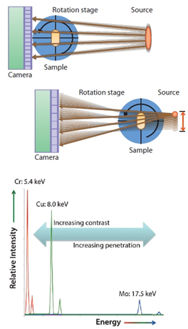 Các biểu đồ ở bên phải cho thấy ba loại anode chính được làm bằng các vật liệu khác nhau đi kèm nano3DX: crom, đồng và molypden, và những ảnh hưởng của chúng đối với thí nghiệm. Năng lượng tia X-ray lớn thì khả năng đâm xuyên càng lớn ngược nhưng độ tương phản đối với các vật liệu có nguyên tử khối thập lại giảm. Đối với xương và silicat, Mo thường được sử dụng, nhưng đối với vật liệu chứa cacbon, thì a-nốt làm bằng Cu hoặc Cr thường được sử dụng. Sự linh hoạt này là điều cần thiết để có được hình ảnh chất lượng cao, độ tương phản cao một cách nhanh chóng.