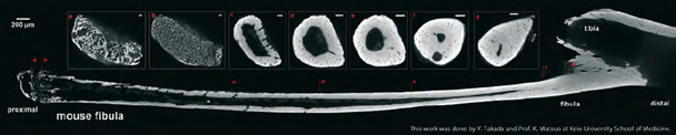Kính hiển vi cắt lớp nano3DX là một thiết bị lý tưởng cho phân tích các mẫu xương ở độ phân giải dưới micro. Một trong những tính năng quan trọng của nano3DX là khả năng quan sát các mẫu lớn ở độ phân giải cao. Trong ví dụ dưới đây, toàn bộ xương mác chuột đã được phân tích bằng nano3DX, lần đầu tiên một phân tích toàn bộ xương đã được thực hiện.