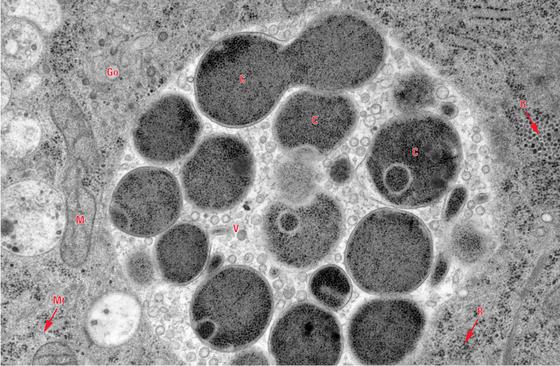 Hình 2: Ảnh phóng đại lớn hơn để quan thể vùi của tế bào (C), Chlamydia pneumoniae cells; (G), Glycogen granules; (Go), Golgi; (M), Mitochondrium; (Mt), Microtubules; (R), Ribosomes; (V), Vesicles. Scale bar 500 nm Kaech A, University of Zurich, Switzerland