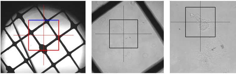 Ảnh 1: Ảnh tổng quan tế bào PtK2 trồng trên đĩa ngọc bích. Ô vuông xác định vị trí trên lưới đồng được định vị ngay phía trên tế bào để đánh dấu vị trí mẫu.