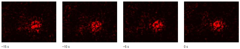 Ảnh 3: Chấm lượng tử huỳnh quang bên trong tế bào. Các cấu trúc có các chấm lượng tử bên trong tế bào được quan sát trực tiếp, dựng phim chuỗi ảnh được chụp mỗi giây. Hình ảnh tĩnh được hiển thị trong 5 giây. Ảnh cuối là ảnh chụp cuối cùng trong chuỗi ảnh (do đó thời gian = 0 giây). Tại đây, bộ nạp mẫu nhanh được chuyển từ vị trí gá trên bệ mẫu vào máy kết đông áp suất cao, sau đó mẫu được kết đông.