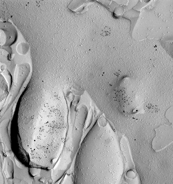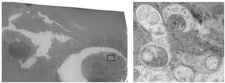Hình 4: Ảnh hiển vi điện tử mẫu tế bào (trái), phóng đại để quan sát thấy cấu trúc quan tâm (phải): Ảnh hiển vi điện tử tế bào được quan tâm (trái). Vị trí khoanh ô là cấu trúc quan tâm được phóng đại ở phía bên phải. Mũi tên chỉ chấm lượng tử được quan sát thấy bên trong cấu trúc. So sánh hình chữ C trong cấu trúc này với ảnh cuối ở Hình 3 thì cũng quan sát thấy hình chữ C. Lưu ý là ảnh hiển vi điện tử được cắt lát 70nm trong khi ảnh huỳnh quang được cắt lát khoảng 1µm. (Paul Verkade, University of Bristol, UK).