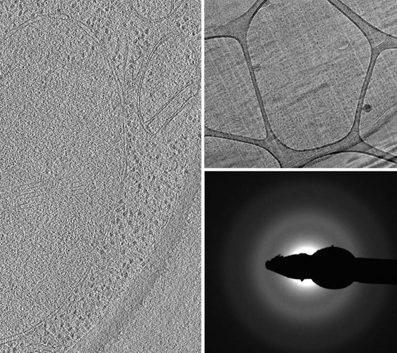 | Ảnh chụp mẫu nấm men bằng kỹ thuật hiển vi điện tử nhiệt độ thấp lát mỏng kết đông (CEMOVIS: cryo-electron microscopy of vitreous sections) Al-Amaudi, DZNE, Bonn | Hình 2 ─ Ảnh chụp vi khuẩn hình que với phương pháp chuẩn bị mẫu kết đông áp suất cao Dr. Carmen Lopez-Iglesias, Lidia Delagado, Elena Mercade, CC i-University Barcelona, Sciene Park |