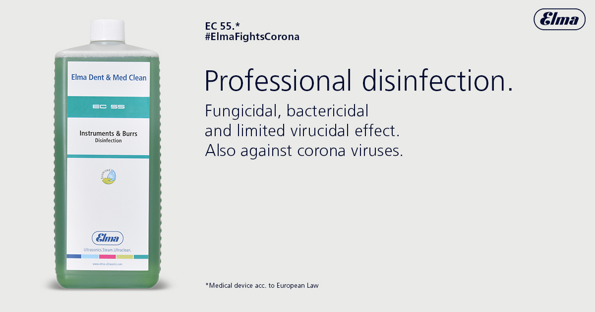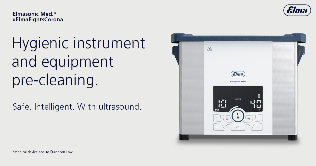 Thiết bị làm sạch bằng sóng siêu âm Elmasonic Med và hóa chất làm sạch Elma Dent & Med Clean - EC 55 đảm bảo làm sạch sơ bộ các dụng cụ và thiết bị cấy ghép, nha khoa và phẫu thuật y tế. Ngay cả những chất bẩn cứng đầu nhất cũng có thể được loại bỏ dễ dàng bằng cách sử dụng các chế độ với siêu âm của Elmasonic Med.