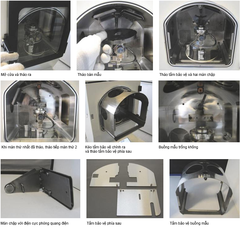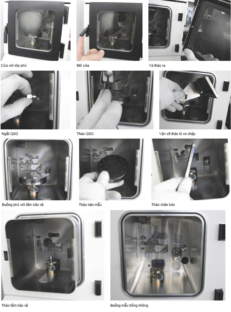Phủ mẫu là cần thiết để làm tăng chất lượng hình ảnh SEM. Khác với các loại máy phủ thông thường thì tất cả các bộ phận của Leica EM ACE có thể tháo rời để vệ sinh hoặc trong trường hợp cần cực kì sạch có thể thay thế phụ kiện mới. Ví dụ như cửa kính lớn có thể tháo rời với bề mặt phẳng dễ lau chùi. Tấm bảo vệ bên trong, màn chập, đế và nguồn phát cũng có thể dễ dàng tháo rời để làm sạch. Hướng dẫn dưới đây mô tả quy trình làm vệ sinh LEICA EM ACE cũng như cách tháo rời các bộ phận bên trong.