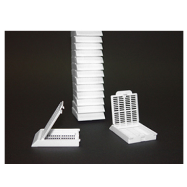 Leica Jet II Tissue Cassettes, which are molded from a special high density acetal polymer, keep specimens safely submerged and are totally resistant to the chemical action of solvents used in histology laboratories.