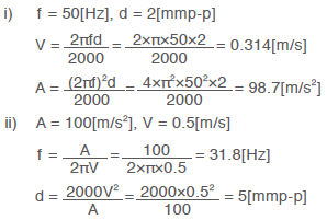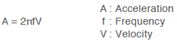 Đẳng thức này cho thấy gia tốc A tăng 100 lần khi tần số f tăng 10 lần. Trên đồ thì bên dưới, chúng ta có thể thấy gia tốc tăng từ 1m/s2 tới 100m/s2 khi tần số tăng từ 1Hz tới 10Hz