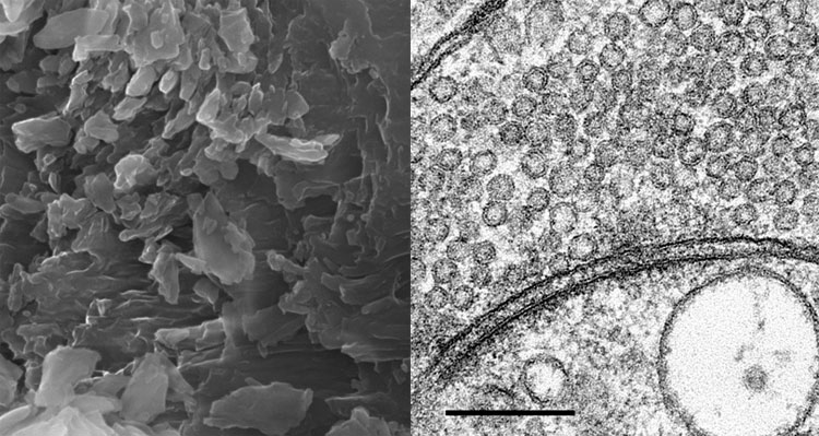 Ảnh trái: Kem chống nắng bị kết đông, giáo sư D. Pum, trường Đại học Tài nguyên và Khoa học sự sống, Viên, Áo và C. Tomova, S. Mimietz-Oeckler, Leica Microsystems, Viên, Áo | Ảnh phải: Synapse đối xứng, Tiến sĩ Shuwen Chang, Đại học Charité, Berlin, Đức.