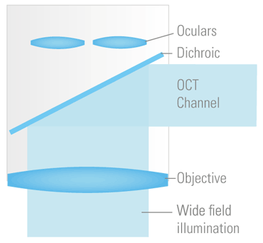 The EnFocus was designed for intrasurgical imaging. The unique objective delivery design injects the OCT signal below the optics carrier, and not through the microscope oculars. This design maximizes OCT image performance.