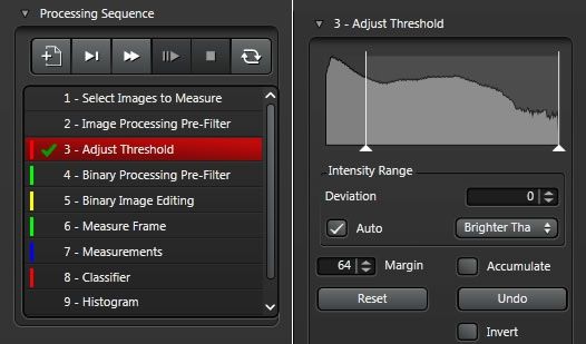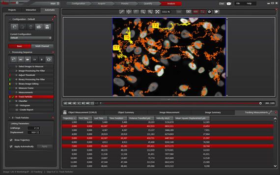 Obtain reproducible analysis results rapidly and easily with the 3D and 2D image analysis wizards. Go step by step through the guided workflow: from applying filters, thresholding, and binary image processing to measurements and classification. Use a binary reference mask in multi-channel image analysis, for example, to count the number of spots in each nucleus. In addition, you can perform 2D tracking experiments or call ImageJ macros from within the 2D analysis wizard.