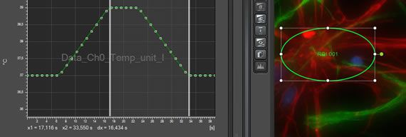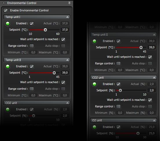 In combination with LAS X Live Data Mode, macros can be generated to run temperature profiles. Acquisition can be set to start once a predefined temperature is reached. During the waiting time, a message displays the difference between nominal and actual environmental parameters. Alternatively, you can define that acquisition commences during ramping up of the temperature.