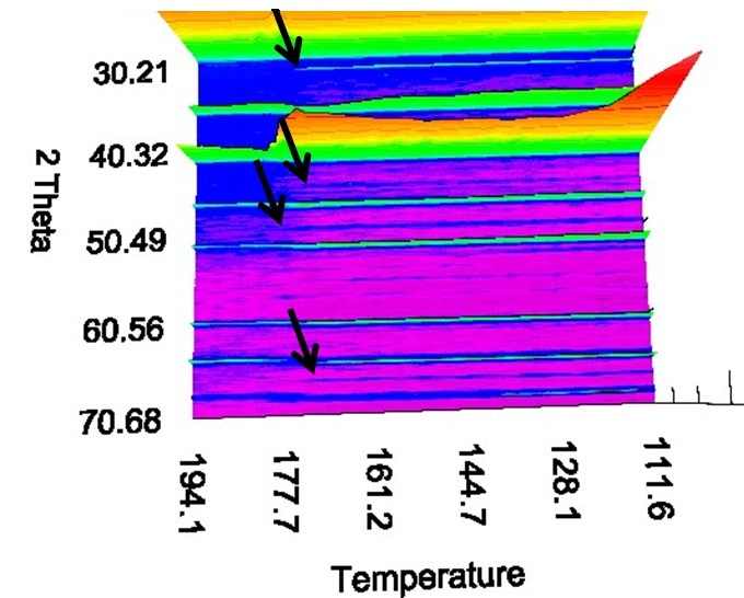 Việc chuyển tiếp pha được trình bày ở đây xảy ra ở nhiệt độ cao hơn như đã báo cáo trong tài liệu, nhưng vì không có bất kỳ việc dừng nào xung quanh nhiệt độ chuyển pha, và thực tế là mẫu được làm nóng từ dưới đáy, và với các tia X, kết quả cho thấy phần trên cùng của bề mặt phải mất thời gian trước khi có thể quan sát được một cách hiệu quả trong các mẫu nhiễu xạ. Thử nghiệm được thực hiện ở đây cần được hiểu là một sàng lọc nhanh trước khi lặp lại các phép thí nghiệm khác với tốc độ chậm hơn nhiều so với nhiệt độ chuyển pha.
