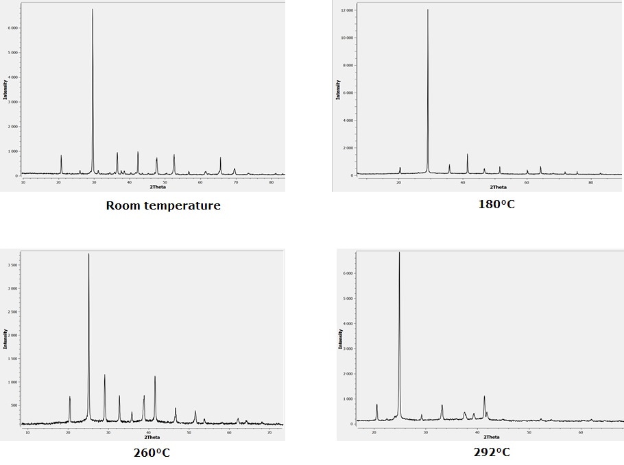Ở nhiệt độ cao hơn, khoảng 250°C (ở 219°C trong tài liệu) các mẫu sẽ chuyển sang pha thứ hai. Nó rất rõ ràng vì có sự chuyển đổi từ dạng khối sang dạng rhombohedral.