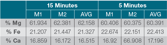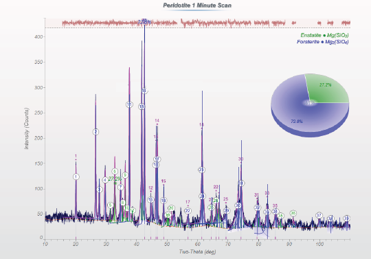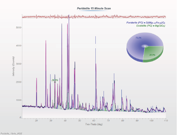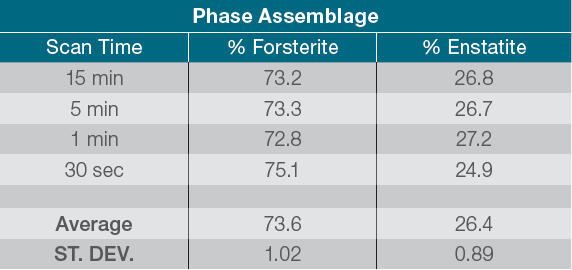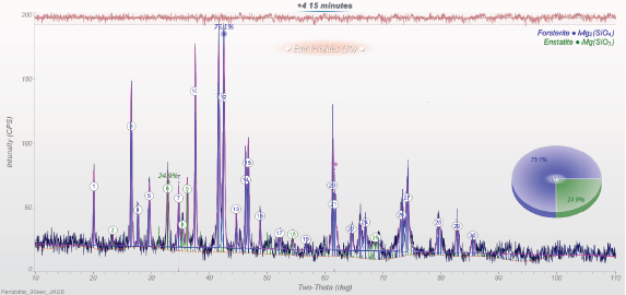 Dữ liệu thô từ 4 lần quét được phân tích bằng cách sử dụng JADE 2010. Bộ dữ liệu 15 phút và 5 phút (Hình 7 và 8) trải qua một phân tích WPF tiếp sau là một bước sàng lọc Rietveld cấu trúc toàn phần, sàng lọc các vùng cư trú M1 và M2 của forsterite (Bảng 1). Bước sàng lọc cuối cùng có Rwp = 6.12 và 7.83 với S = 1,65 và 1,23 tương ứng đối với tập dữ liệu 15 phút và 5 phút.