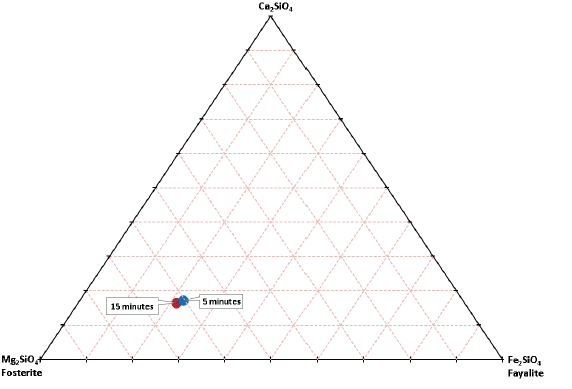 Do tổng các giá trị vùng cư trú của Mg và Fe không chiếm tới 100%, nên giá trị còn lại được gán cho Ca để bổ sung vào sơ đồ bậc 3 trong Hình 9. Từ sơ đồ, có thể kết luận rằng sự phù hợp nhất là với khoáng forsterit thông qua các giá trị hóa học của (Mg1.24,Fe0.43,Ca0.33)SiO4 trong 15 phút quét và (Mg1.21,Fe0.45,Ca0.34)SiO4 trong 5 phút quét.