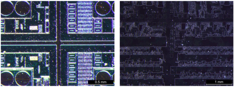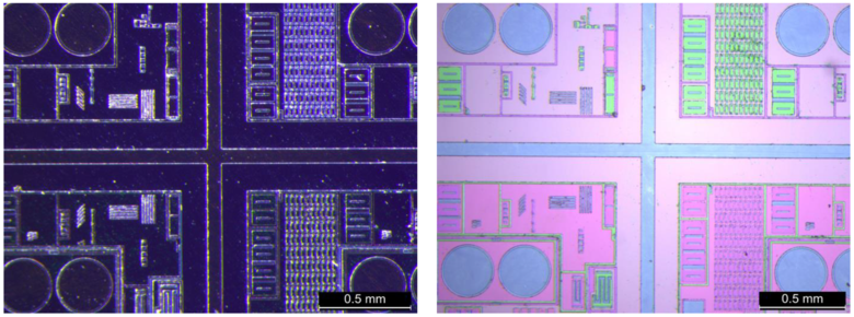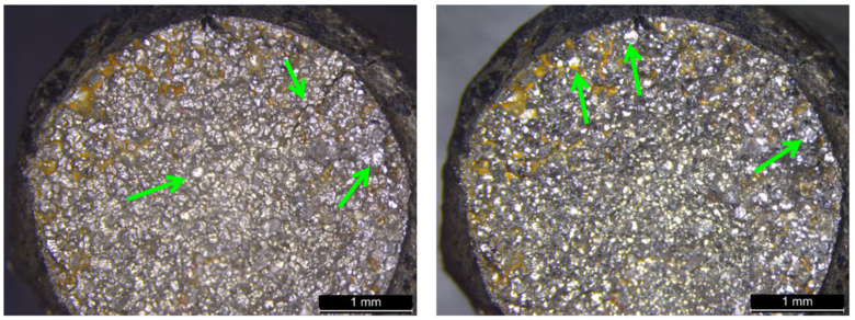 Trái: Nguồn sáng đồng trục (CXI): quan sát rõ các vết sước và vân bề mặt; Phải: Nguồn sáng chiếu điểm (SLI): quan sát đa chi tiết mẫu