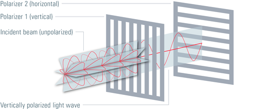 Hình 2: Ánh sáng mặt trời hoặc ánh sáng được tạo ra bởi một bóng đèn không được phân cực. Điều đó có nghĩa là các sóng điện từ dao động ở tất cả các hướng. Nếu nguồn sáng không phân cực đi qua bộ phân tích thứ nhất (1), thì quá trình phân phân cực sẽ diễn ra, trong trường hợp ánh sáng phân cực theo chiểu thẳng đứng. Nếu ánh sáng phân cực sau đó đi đến bộ phân cực thứ hai (2) có góc 90° so với bộ phân cực thứ nhất (1) thì không có ảnh nào đi qua bộ phân cực thứ hai (2). Do đó, nếu hai bộ phân cực được đặt ở góc 90° so với nhau thì được gọi là “vị trí tối” vì không có ánh sáng nào có thể nhìn được sau bộ phân cực thứ hai (2).