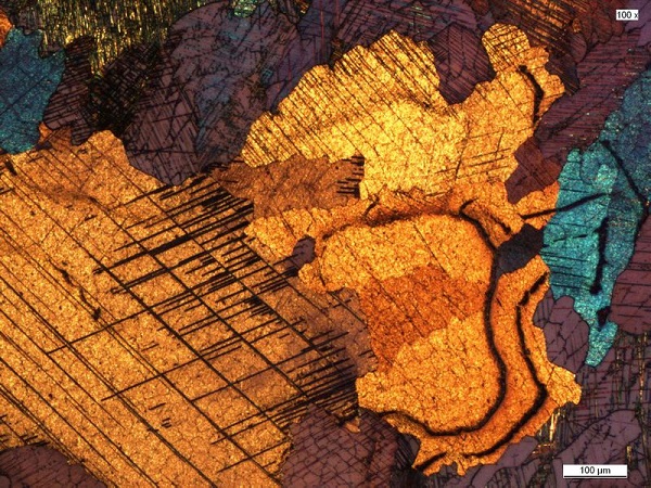 Hình 4: Mẫu coban, cán nguội, ăn mòn Beraha, phân cực. Kiểm tra hình thái cấu trúc đóng vai trò quyết định trong nghiên cứu khoa học vật liệu và phân tích khuyết tật. Cấu tạo vi cấu trúc chi tiết và tương phản mầu sắc được phát huy bởi quá trình phân cực quang học với mẫu đã ăn mòn dưới kính hiển vi phân cực.