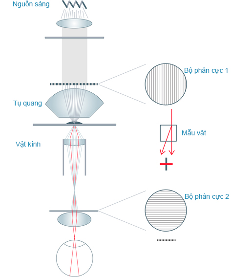 Hình 1: Nguyên lý của hiển vi phân cực: Ánh sáng được phân cực bởi bộ phân cực thứ nhất (1). Sau khi đi qua bộ phân cực thứ nhất (1), ánh sáng được lấy tiêu cự trên mẫu bằng một bộ tụ hiển vi. Nếu mẫu là khúc xạ kép hoặc có cấu trúc khúc xạ kép thì mặt phẳng phân cực của một phần ánh sáng sẽ được xoắn vòng 90° (được thể hiện bằng vạch đỏ trên hình vẽ). Ảnh mẫu vật được phóng đại bằng vật kính và đi tới bộ phân cực thứ hai (2). Nếu bộ phân cực thứ hai (2) được xoắn vòng 90° so với vị trí của bộ phân cực thứ nhất (1) (được gọi là “vị trí tối”) thì chỉ có phần ánh sáng đi qua vật liệu khúc xạ kép mới có thể đi qua và nhìn thấy được. Do đó, chỉ có cấu trúc phân cực mới có thể quan sát được.