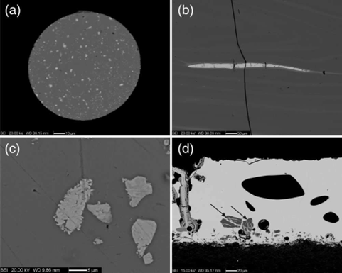 (b) một mảnh oxit sắt có trong kính đỏ; (c) các hạt có mặt trên mảnh gốm vàng; (d) các hạt sắc tố đen lớn (mũi tên ) ở đáy men trong đồ gốm trang trí màu đen.