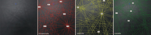 Hình 5 Một bộ bốn bức ảnh đại diện cho mẫu EBSD được tạo ra. Cùng một kiểu hình EBSD được lập chỉ mục khác nhau, với các vạch chồng màu, đề xuất giải pháp đúng (bindehimite = đỏ) và hai giải pháp sai khác (nadorite = vàng; rosiaite = xanh lục)