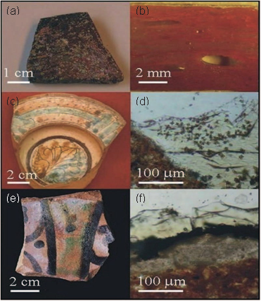 (3) Đồ gốm trang trí màu đen (thế kỉ thứ 9-10 sau công nguyên) từ địa điểm Merv/Mary City (Turkmenistan). Tất cả các mẫu này đã được nghiên cứu thông qua các phép đo khác nhau như kính hiển quang học (OM), kính hiển vi điện tử quét (SEM), phổ tán xạ năng lượng tia X (EDS/WDS), nhiễu xạ bột tia X (XRPD) và quang phổ phát xạ nguyên tử plasma kết hơp tư cảm (ICP-AES) (Casellato và các cộng sự 2004, 2007, 2010; Fenzi và các cộng sự 2006, 2007; Brianese và các cộng sự 2008), đã được tóm tắt như bên dưới để đưa ra một cái nhìn tổng quan về thành phần và các đặc trưng của các đồ tác tạo này. Trên cơ sở các dữ liệu đã đạt được, một vài mẫu đã được chọn cho phép đo EBSD và các mẫu này nếu cần sẽ được phân tích lại bằng phép đo EDS-WDS để đạt được các thông tin điểm cụ thể, điều này rất hữu ích cho các kĩ thuật sản xuất đặc biệt là các nguyên liệu thô đã dùng,