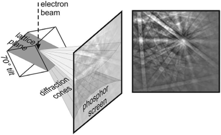 Trong EBSD, một chùm điện tử được hướng trực tiếp lên một mẫu nghiêng (Hình 2). Các điện tử này tương tác với các nguyên tử trong mạng tinh thể và một vài điện tử tán xạ thoát ra từ mẫu. Nếu màn hình photpho huỳnh quang được đặt gần mẫu, một hình ảnh nhiễu xạ sẽ xuất hiện trên màn hình bởi vì cường độ của các điện tử thay đổi theo nhiều hướng khác nhau. Hình ảnh này mang đầy đủ đặc trưng về cấu trúc tinh thể và định hướng của vùng mẫu được tạo ra. Hình ảnh nhiễu xạ có thể được dùng để đo đạc định hướng tinh thể, đo đạc các biên hạt sai định hướng và phân biệt những vật liệu khác. Ở chế đô xác định pha (Nowell and Wright 2004; El-Dasher and Deal 2009),