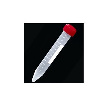 15mL centrifuge tube (PP) with red screwcap (HDPE) and printed graduations.