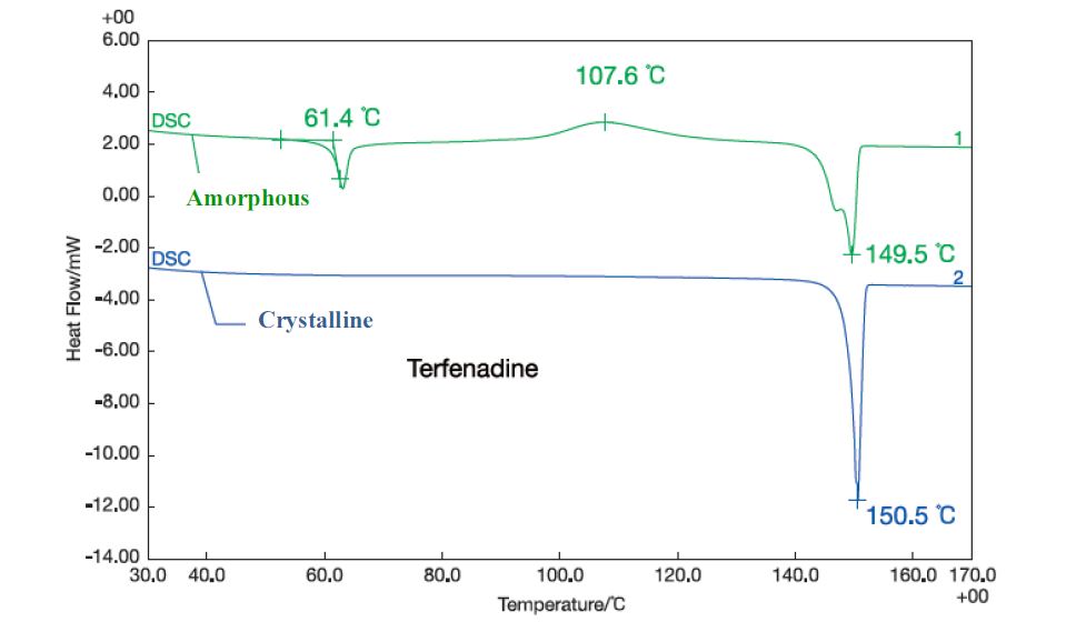 Do đó, chất kết tinh hoặc chất vô định hình có thể được xác định qua đỉnh tỏa nhiệt trong quá trình kết tinh và sự dịch chuyển đường cơ sở trong quá trình chuyển hóa thủy tinh.
