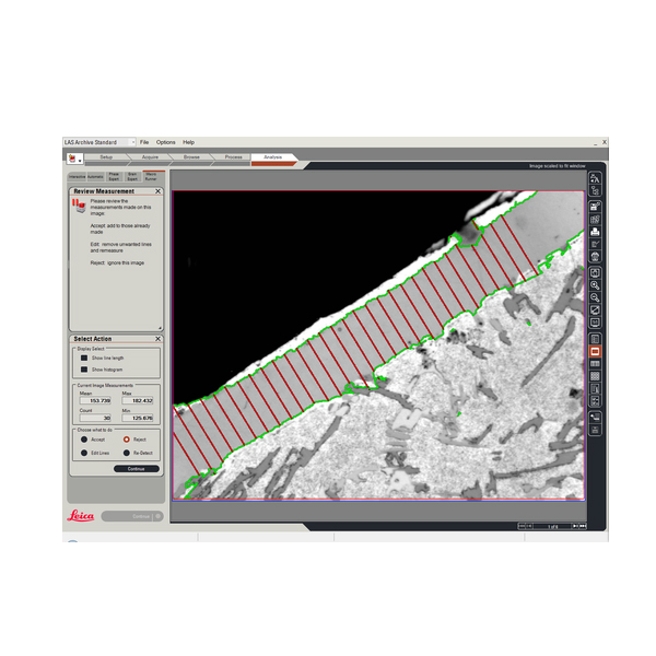 Phần mềm LAS (Leica Application Suite) thu nhận ảnh với những cải tiến mới nhất trong kỹ thuật hiển vi, tính toán và phân tích ảnh số. Việc xác định lớp vật liệu được thực hiện nhanh chóng bằng hệ thống xử lý ảnh phức tạp cho phép người vận hành có thể xem xét lại kết quả chỉ trong vài giây.
