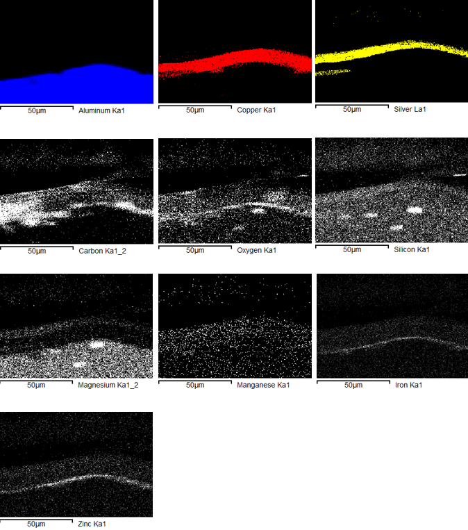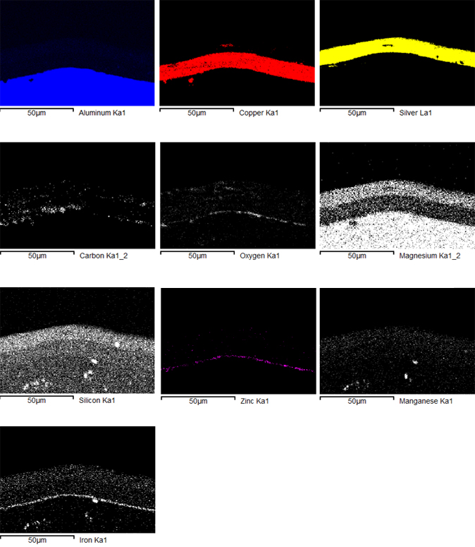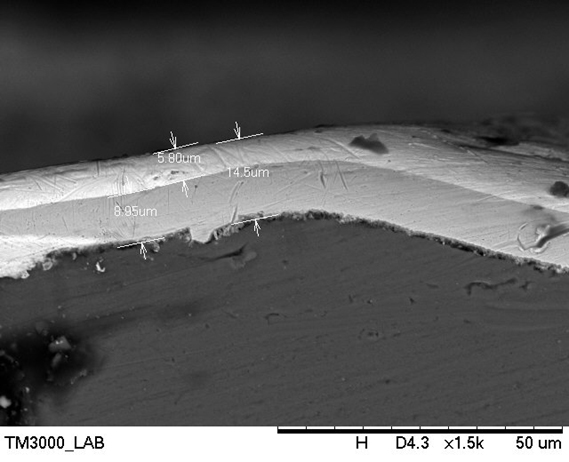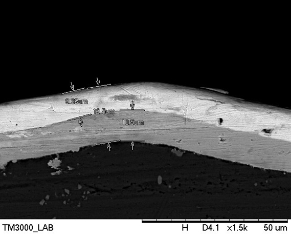 Sau khi xử lý và quan sát bề mặt mẫu bị lỗi và quan sát dưới kính hiển vi điện tử TM3000, chúng ta đã xác định được lỗi phồng rộp xảy ra trên bề mặt mẫu, đo được bề dày lớp phủ bạc và đồng tại vị trí xảy ra lỗi. Ngoài ra, kết hợp với phân tích EDX, chúng ta cũng xác định được thành phần nguyên tố đồng, bạc và kẽm của các lớp phủ tại vị trí xảy ra lỗi.