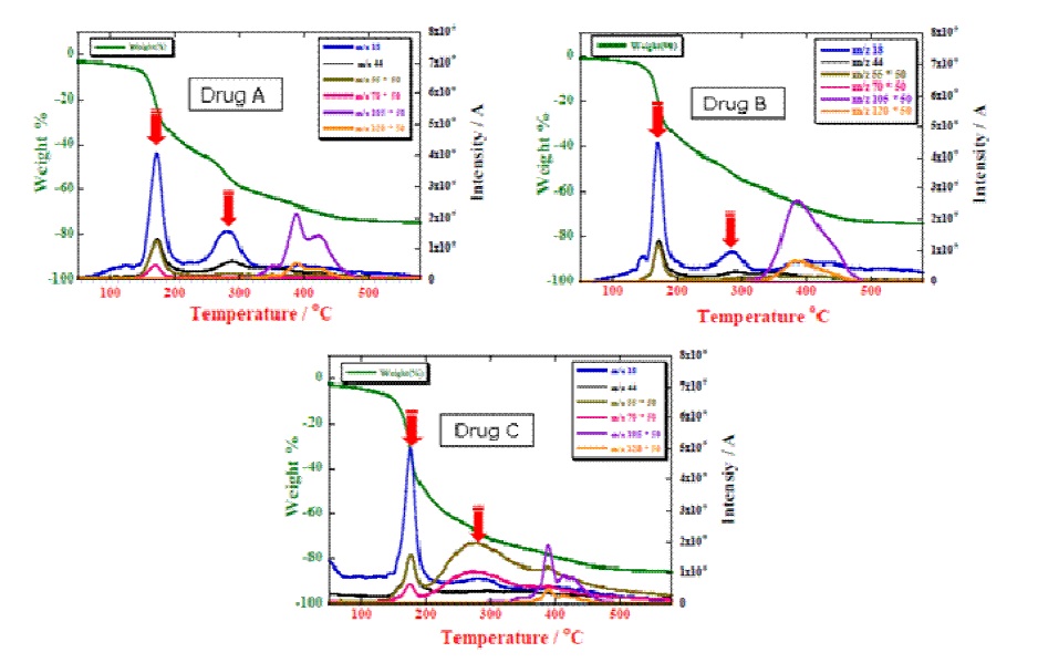 Các khối phổ này cho thấy các loại khí bay hơi được đặc trưng bởi các ion m/z 18, 55, 70, 105 và 120 chỉ ra các thành phần phân hủy của thuốc. Trong khi kết quả đo TG cho thấy ba bước giảm khối lượng hàng loạt. Khi xem xét từng loại thuốc, thành phần phân hủy của thuốc A có thể được thấy ở hai bước khử nước (m/z 18) ở 156oC và 280oC trong khi tạo ra CO2 (m/z 44) ở 285oC.