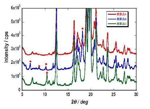 Các đỉnh nhiễu xạ quan sát có vẻ khác biệt nhỏ tương ứng với các thuốc đó, những khác biệt này có thể bắt nguồn từ sự đa hình hoặc thành phần tinh thể (xem ◆ điểm).
