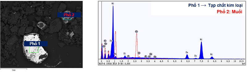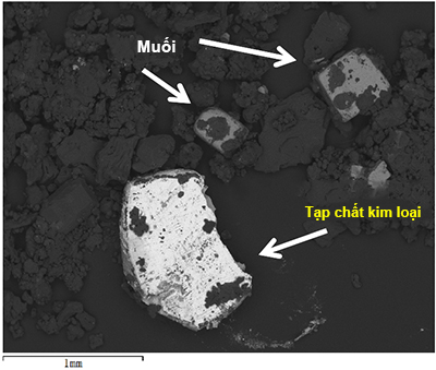 Bước 1: Mẫu vật được quan sát chi tiết dưới kính hiển vi điện tử quét (SEM). Ảnh dưới đây giúp phát hiện được sự hiện hữu của kim loại sắt (Fe) và sự tồn tại của thành muối (Salt) trong mẫu.