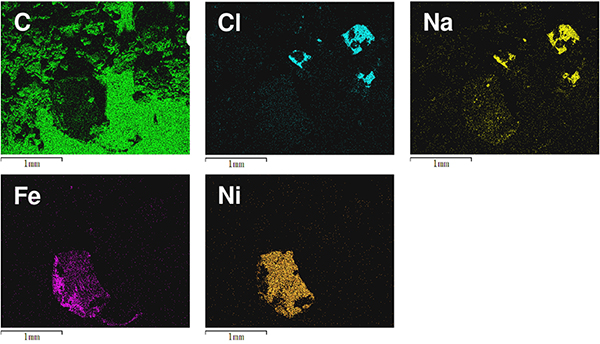 Bước 2: Sử dụng chức năng Mapping của hệ thống phổ tán xạ năng lượng tia X (EDX) để thể hiện bản đồ phân bố nguyên tố của các vật chất trên mẫu vật. Kết quả cho thấy có sự hiện hữu và phân bố của các nguyên tố như C, Cl, Na, Fe, Ni. Trong đó, Fe là tạp chất kim loại.