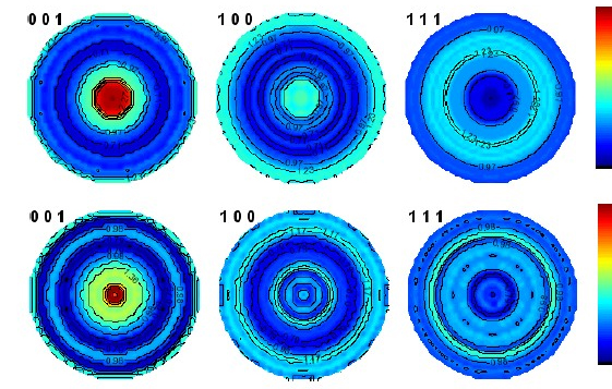 {001}, {100} và {111} các biểu đồ cực được tính toán lại từ OD được phân tích kết hợp cho a) mẫu PZT ở dạng đúc b) mẫu PZT ở dạng đúc và thiêu kết được tổng hợp bằng PbO tinh khiết. Thước khối lượng tuyến tính, phép chiếu tương đương.