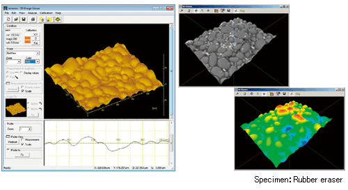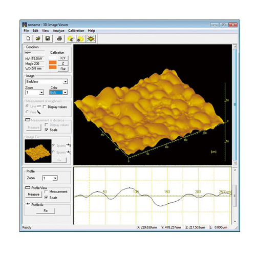● Ảnh 3 chiều có thể được xoay hoặc phóng đại bằng cách sử dụng chuột máy tính ● Ảnh 3 chiều có thể đạt được mà không cần phải xoay mẫu hoặc không cần lo lắng về dịch ảnh với phần mềm 3D-View. Tín hiệu được dò bởi đầu dò Quad BSE với 4 phần tử dò ở 4 hướng khác nhau. ● Khoảng cách chiều cao giữa 2 điểm và độ nhấp nhô bề mặt mẫu có thể được đo từ nhiều biên dạng. ● Các hình ảnh 3D có thể được lưu trữ ở định dạng AVI.
