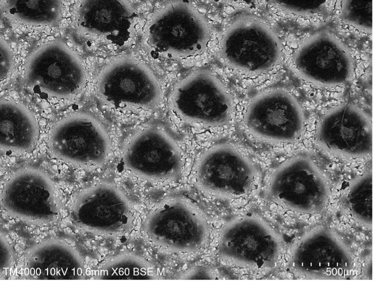 Trong chế độ SE, các mắt lưới trên nắp sữa chua về cơ bản có hình dạng bán cầu tương tự nhau và được phân bố đều. Ngược lại, trong chế độ BSE, các hình bán cầu gần như vô hình vì chúng không phản xạ chùm electron trở lại đầu dò. Do đó, trên hình ảnh BSE, chúng xuất hiện màu đen như thể bị lõm xuống.