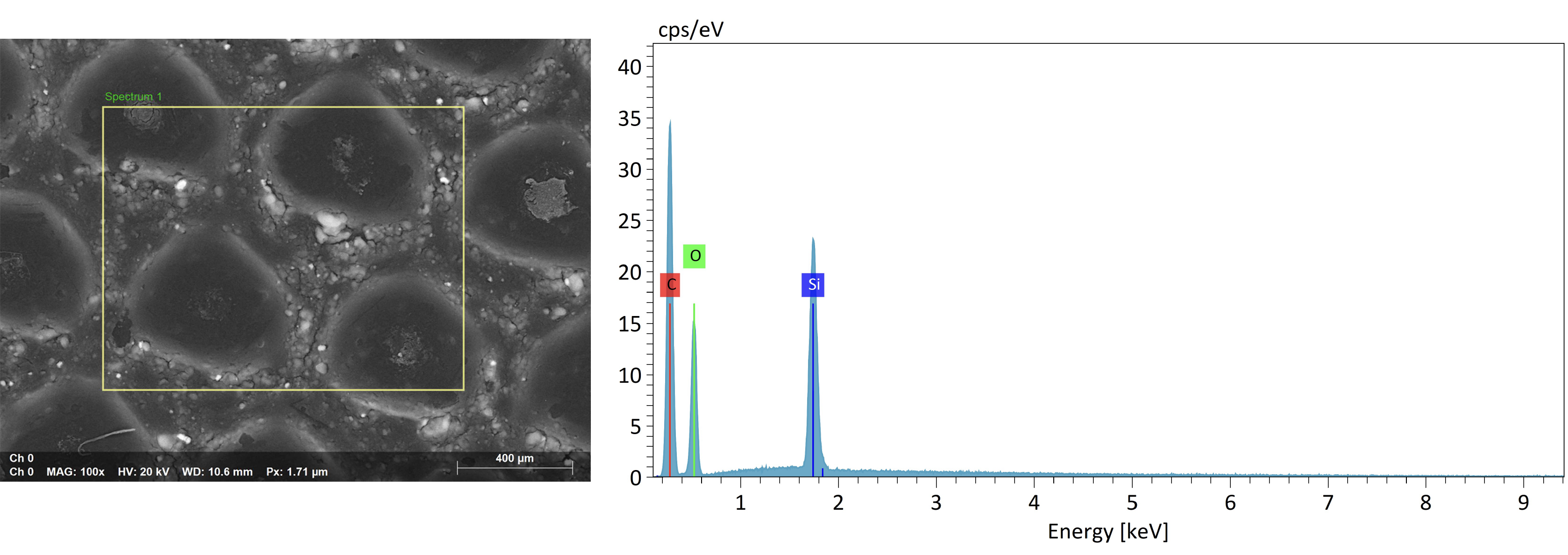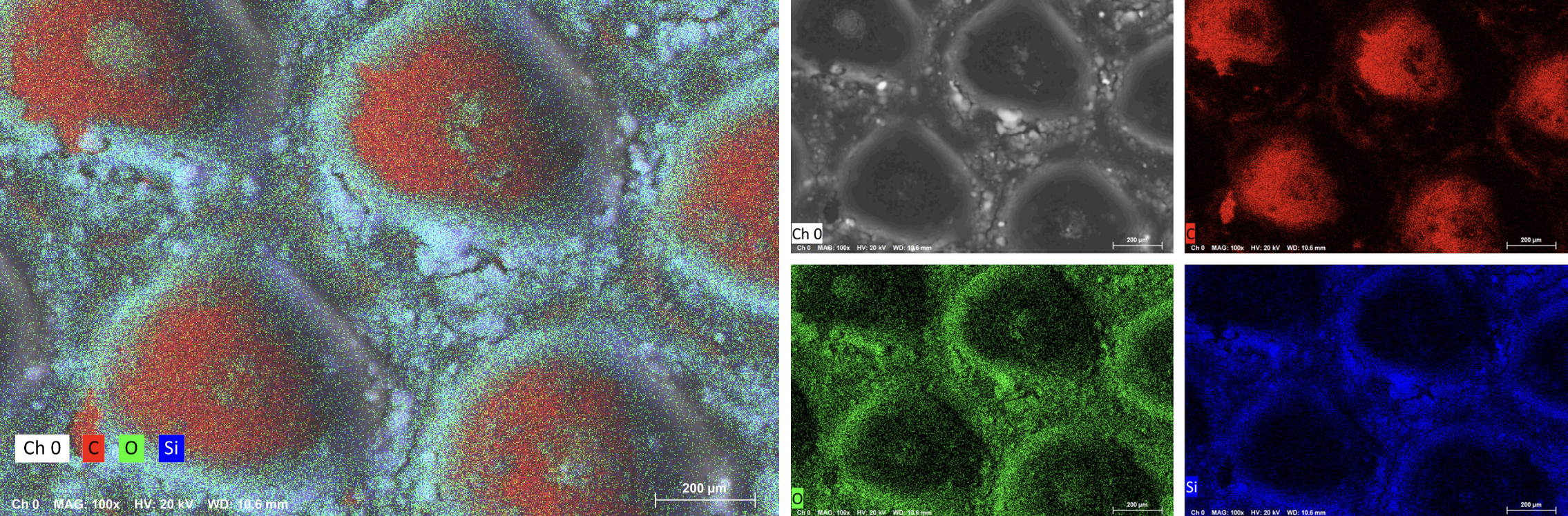 Kết quả phân tích mapping cho thấy rằng những vùng màu tối trên các bán cầu trong hình ảnh BSE chứa chủ yếu nguyên tố carbon (C), trong khi những vùng sáng màu là nơi phân bố của nguyên tố silicon (Si).