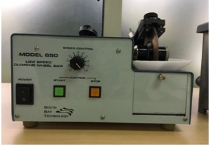 Tùy vào mục đích nghiên cứu mà chúng ta chọn vị trí cắt mẫu phù hợp, có thể dùng máy cắt kim loại, cưa máy, cưa tay…Hình 1 là máy cắt đĩa kim cương tốc độ thấp được dùng để cắt mẫu lá đồng.