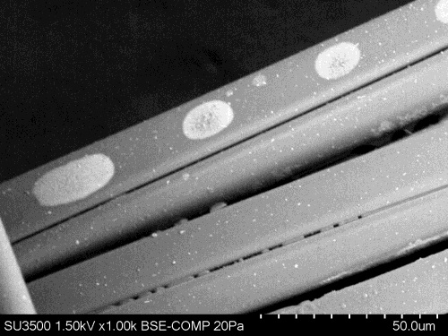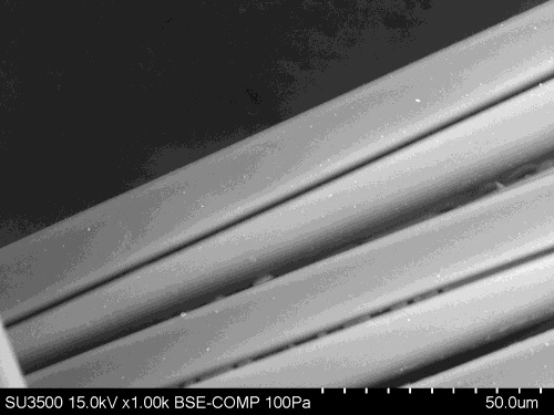Quan sát điện áp gia tốc thấp của các mẫu vật liệu khác nhau đã được chứng minh khả thi bằng SU3500. Hình.1 cho thấy kết quả quan sát của sợi quang (không phủ lớp phủ). Các hạt TiO2 (→) được quan sát rõ ở điện áp gia tốc 1,5 kV (Hình 1a), còn cấu trúc bề mặt mẫu không xuất hiện ở điện áp gia tốc 15 kV nên việc quan sát hạt TiO2 khó khăn ở điện áp gia tốc cao (Hình 1b).
