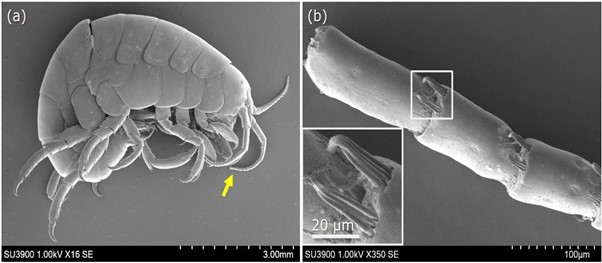 Hình 1 (a) và (b) là kết quả quan sát một loài động vật giáp xác nhỏ, một con tôm nước mặn, được xử lý với 5% IL1000. Hình ảnh tổng thể của tôm nước mặn (a) có thể được quan sát với phần lưng bụng cuộn tròn như hình thái khi sống của nó. Tôm nước mặn bật nhảy bằng cách mở rộng nhanh chóng phần bụng cuộn tròn. Chiếc râu thứ 2 được biểu thị bởi mũi tên màu vàng. Ở hình ảnh phóng đại của râu (b), hình dáng của nó được giữ nguyên mà không bị nhăn nhúm, và ngay cả những chi tiết nhỏ của lông xúc giác nằm gần khớp cũng được quan sát ở hình ảnh phóng to.