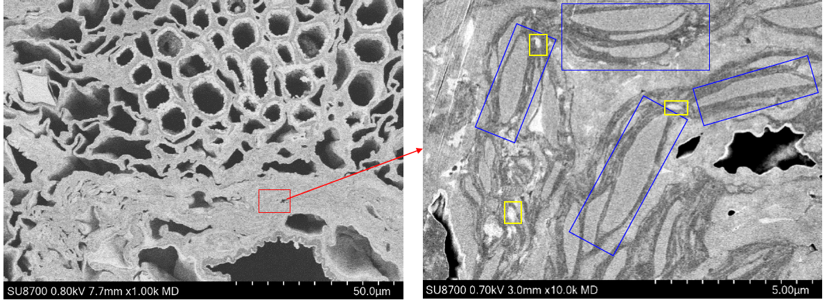 Lục lạp có viền màng thylakoid được quan sát thấy trong các hình chữ nhật màu xanh lam. Các hạt phát sáng trong khung màu vàng là tinh bột. Trong phương pháp huẩn bị mẫu bằng tia ion, năng lượng nhiệt sinh ra trong quá trình chiếu chùm tia lên mẫu có thể làm hỏng mẫu. Mặc dù mẫu thực vật được quan sát lần này thường nhạy cảm với nhiệt, nhưng quá trình chuẩn bị mẫu bằng tia ion làm mát mẫu cho phép bảo toàn các cấu trúc cơ quan trong mặt cắt ngang của tế bào để quan sát bằng SEM.