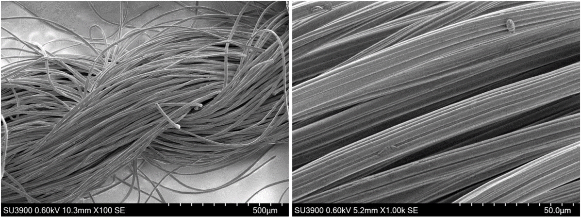 Nhựa resin là một mẫu điển hình khó quan sát bằng SEM do sự tích điện. Ngay cả khi mẫu đã được phủ một lớp ion dẫn điện để giảm thiểu sự tích điện, hiện tượng đó vẫn có thể xảy ra một phần tại những khoảng trống không được phủ giữa các sợi. Trong bài viết này, mẫu không phủ ion được chuẩn bị để quan sát hiện tượng giảm tích điện khi đặt dưới thế gia tốc thấp 0.6 kV và tích hợp các hình ảnh quét nhanh trong hình 1 (a). Hình ảnh phóng đại của các sợi (b) cho thấy không có sự ảnh hưởng của hiện tượng tích điện.