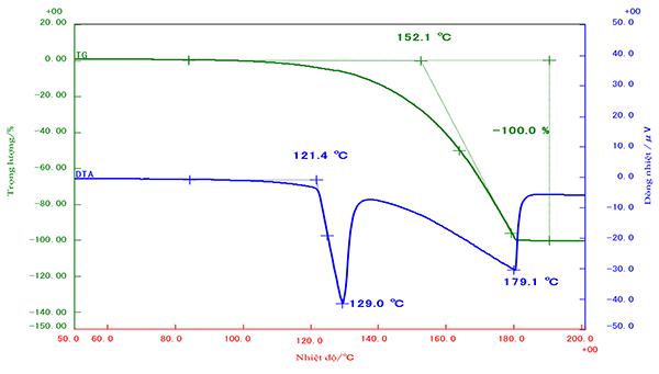 Đồ thị trên thể hiện kết quả phép đo TG-DTA của vật liệu (axit benzoic). Từ đồ thị có thể thấy trọng lượng của mẫu giảm dần theo nhiệt độ, đồng thời cũng có thể quan sát thấy hai điểm thu nhiệt tương ứng ở 90 độ C và 121 độ C do sự nóng chảy của vật liệu. Đặc trưng nhiệt độ như trên là do quá trình nóng chảy của vật liệu diễn ra ngay sau quá trình thăng hoa. Sau khi nóng chảy, trọng lượng vật liệu tiếp tục giảm và kèm theo đó là một điểm thu nhiệt do sự bay hơi. Từ kết quả đo này, có thể thấy rằng hiện tượng thăng hoa, nóng chảy và bay hơi đã diễn ra một cách liên tục bên trong vật liệu.