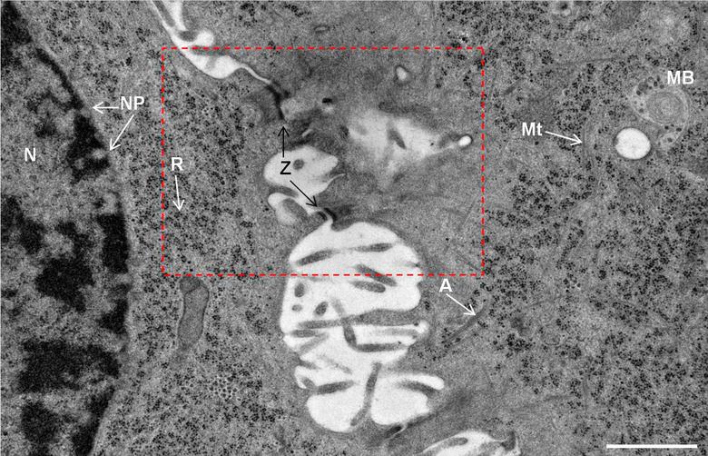 Hình 10: Ảnh lát mỏng tế bào Hep-2 nhiễm vi rút viêm phổi. Ảnh phóng đại lớn hơn cho vùng lựa chọn trong Hình 3. A, sợi Actin; MB Mulitvesicular body; Mt, vi cấu trúc hình ống; N, hạt nhân; NP, hạch nhân, R, Ribô thể; Z, Zonula adhaerens. Thức đo 1 µm