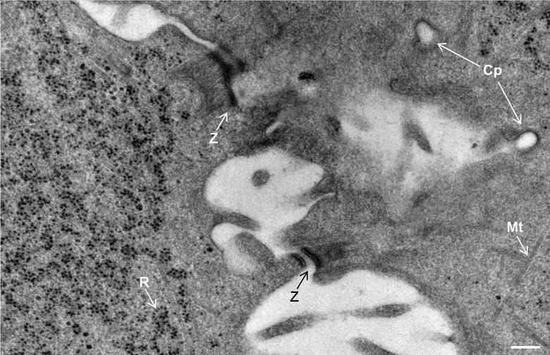 Hình 11: Ảnh lát mỏng tế bào Hep-2 nhiễm vi rút viêm phổi. Ảnh phóng đại cao hơn cho vùng lựa chọn ở Hình 4. Cp, hốc phủ Clathrin; Mt, vi cấu trúc hình ống; R, ribô thể; Z, Zonula adhaerens. Thức đo 200nm